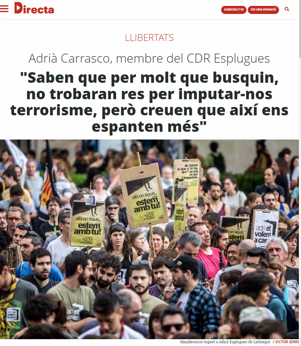 És amb aquestes companyes amb les qui us animo a sortir, aquest diumenge, a les 17.00 a l’Ajuntament d’Esplugues, per denunciar l’arbitrarietat i la desproporcionalitat dels fets que m’imputen, i per deixar ben clar que la seva repressió no ens farà callar.»